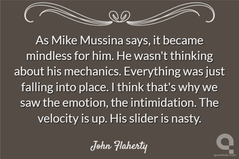 As Mike Mussina says, it became mindless for him. He wasn't thinking about his mechanics. Everything was just falling into place. I think that's why we saw the emotion, the intimidation. The velocity is up. His slider is nasty.