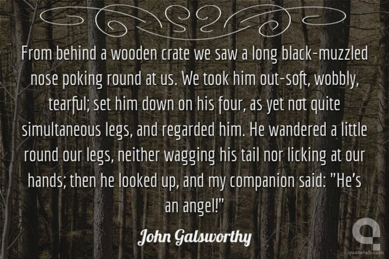 From behind a wooden crate we saw a long black-muzzled nose poking round at us. We took him out-soft, wobbly, tearful; set him down on his four, as yet not quite simultaneous legs, and regarded him. He wandered a little round our legs, neither wagging his tail nor licking at our hands; then he looked up, and my companion said: "He's an angel!"