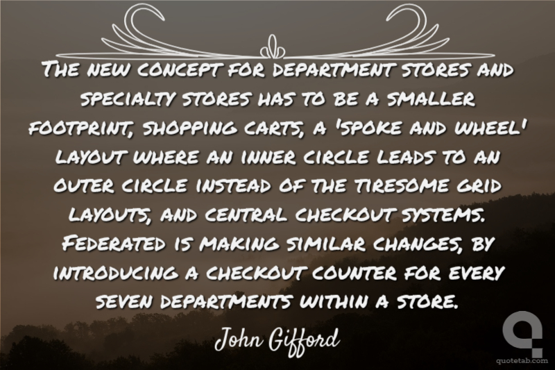 The new concept for department stores and specialty stores has to be a smaller footprint, shopping carts, a 'spoke and wheel' layout where an inner circle leads to an outer circle instead of the tiresome grid layouts, and central checkout systems. Federated is making similar changes, by introducing a checkout counter for every seven departments within a store.