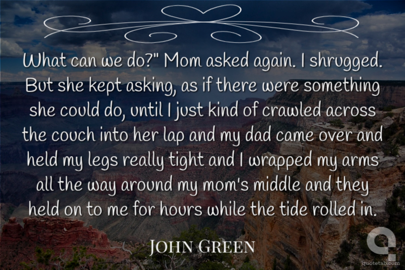 What can we do?" Mom asked again. I shrugged. But she kept asking, as if there were something she could do, until I just kind of crawled across the couch into her lap and my dad came over and held my legs really tight and I wrapped my arms all the way around my mom's middle and they held on to me for hours while the tide rolled in.