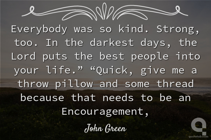 Everybody was so kind. Strong, too. In the darkest days, the Lord puts the best people into your life.” “Quick, give me a throw pillow and some thread because that needs to be an Encouragement,