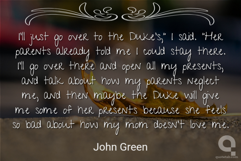 I'll just go over to the Duke's," I said. "Her parents already told me I could stay there. I'll go over there and open all my presents, and talk about how my parents neglect me, and then maybe the Duke will give me some of her presents because she feels so bad about how my mom doesn't love me.