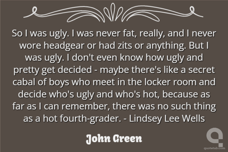So I was ugly. I was never fat, really, and I never wore headgear or had zits or anything. But I was ugly. I don't even know how ugly and pretty get decided - maybe there's like a secret cabal of boys who meet in the locker room and decide who's ugly and who's hot, because as far as I can remember, there was no such thing as a hot fourth-grader. - Lindsey Lee Wells