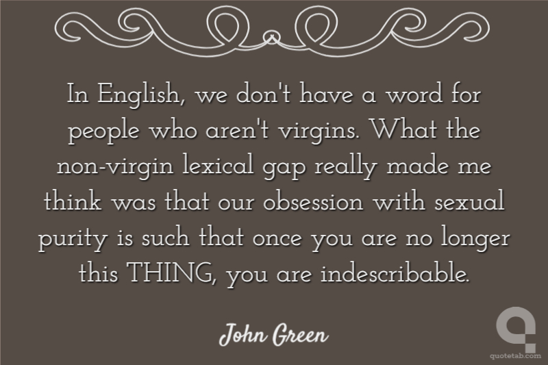 In English, we don't have a word for people who aren't virgins. What the non-virgin lexical gap really made me think was that our obsession with sexual purity is such that once you are no longer this THING, you are indescribable.