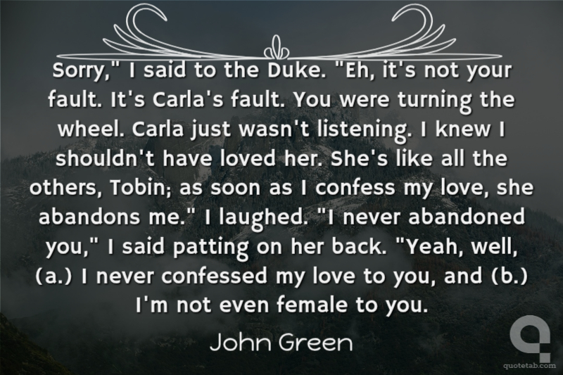 Sorry," I said to the Duke. "Eh, it's not your fault. It's Carla's fault. You were turning the wheel. Carla just wasn't listening. I knew I shouldn't have loved her. She's like all the others, Tobin; as soon as I confess my love, she abandons me." I laughed. "I never abandoned you," I said patting on her back. "Yeah, well, (a.) I never confessed my love to you, and (b.) I'm not even female to you.