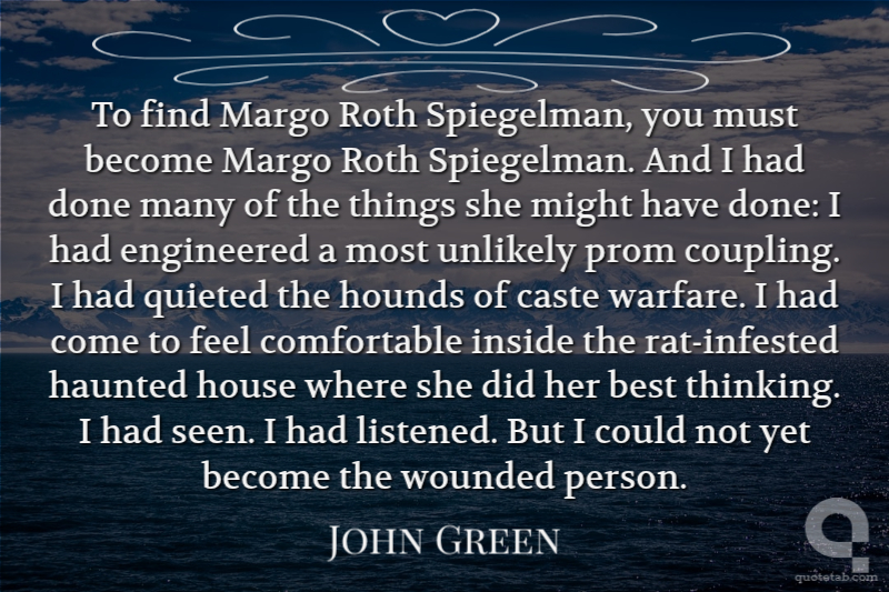 To find Margo Roth Spiegelman, you must become Margo Roth Spiegelman. And I had done many of the things she might have done: I had engineered a most unlikely prom coupling. I had quieted the hounds of caste warfare. I had come to feel comfortable inside the rat-infested haunted house where she did her best thinking. I had seen. I had listened. But I could not yet become the wounded person.