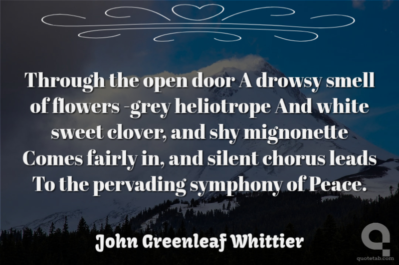 Through the open door A drowsy smell of flowers -grey heliotrope And white sweet clover, and shy mignonette Comes fairly in, and silent chorus leads To the pervading symphony of Peace.
