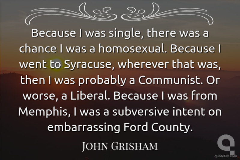 Because I was single, there was a chance I was a homosexual. Because I went to Syracuse, wherever that was, then I was probably a Communist. Or worse, a Liberal. Because I was from Memphis, I was a subversive intent on embarrassing Ford County.
