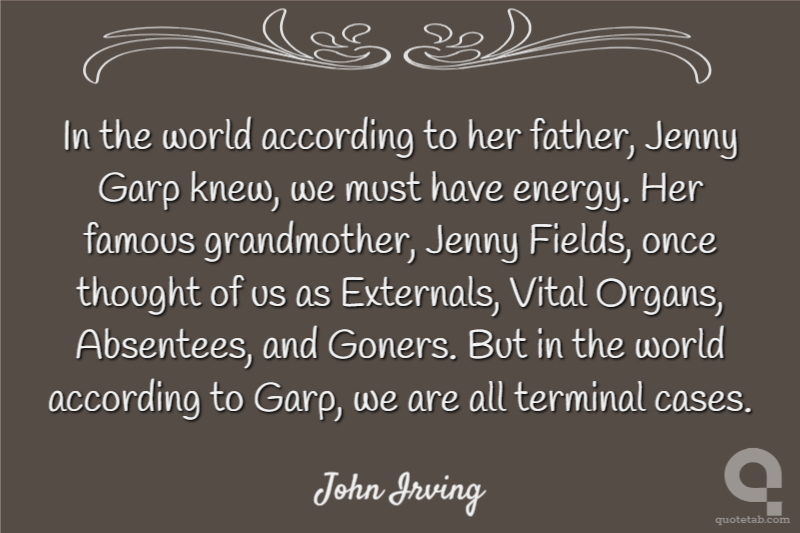 In the world according to her father, Jenny Garp knew, we must have energy. Her famous grandmother, Jenny Fields, once thought of us as Externals, Vital Organs, Absentees, and Goners. But in the world according to Garp, we are all terminal cases.