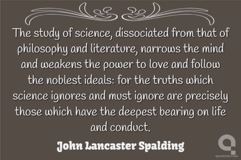 The study of science, dissociated from that of philosophy and literature, narrows the mind and weakens the power to love and follow the noblest ideals: for the truths which science ignores and must ignore are precisely those which have the deepest bearing on life and conduct.