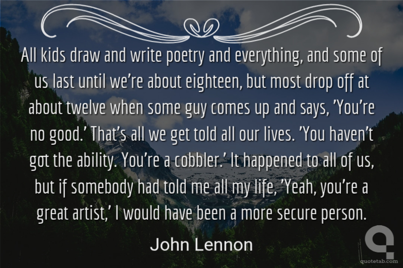 All kids draw and write poetry and everything, and some of us last until we're about eighteen, but most drop off at about twelve when some guy comes up and says, 'You're no good.' That's all we get told all our lives. 'You haven't got the ability. You're a cobbler.' It happened to all of us, but if somebody had told me all my life, 'Yeah, you're a great artist,' I would have been a more secure person.