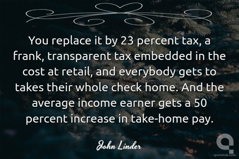 You replace it by 23 percent tax, a frank, transparent tax embedded in the cost at retail, and everybody gets to takes their whole check home. And the average income earner gets a 50 percent increase in take-home pay.