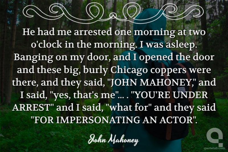 He had me arrested one morning at two o'clock in the morning. I was asleep. Banging on my door, and I opened the door and these big, burly Chicago coppers were there, and they said, "JOHN MAHONEY," and I said, "yes, that's me"... . "YOU'RE UNDER ARREST" and I said, "what for" and they said "FOR IMPERSONATING AN ACTOR".