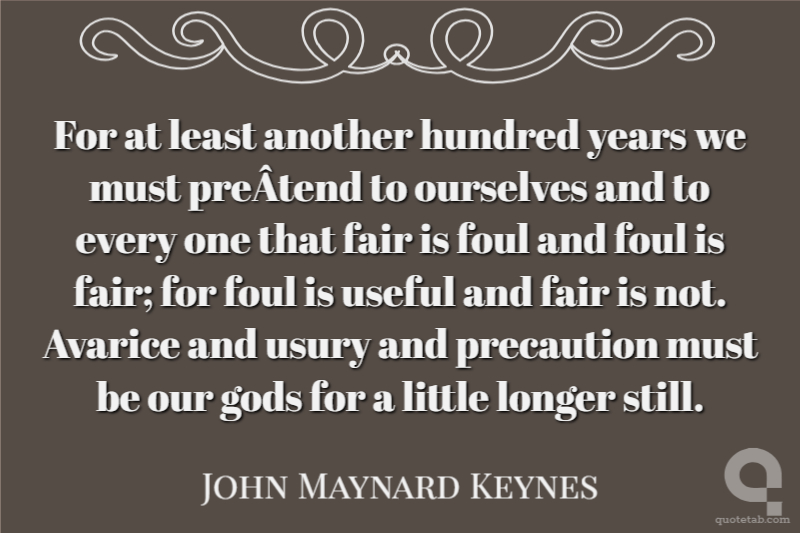 For at least another hundred years we must preÂtend to ourselves and to every one that fair is foul and foul is fair; for foul is useful and fair is not. Avarice and usury and precaution must be our gods for a little longer still.