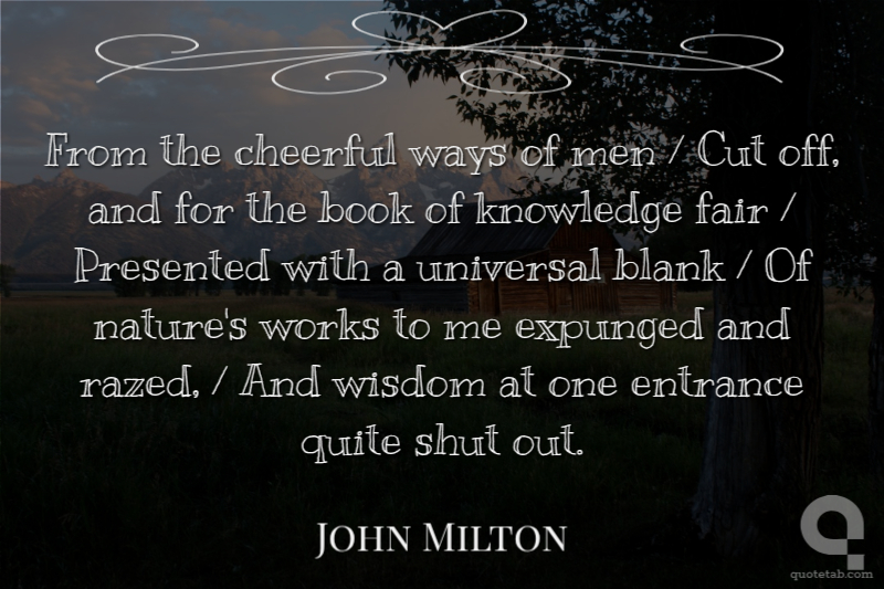 From the cheerful ways of men / Cut off, and for the book of knowledge fair / Presented with a universal blank / Of nature's works to me expunged and razed, / And wisdom at one entrance quite shut out.