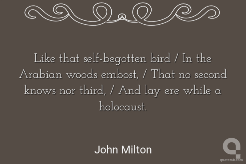Like that self-begotten bird / In the Arabian woods embost, / That no second knows nor third, / And lay ere while a holocaust.