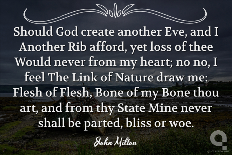 Should God create another Eve, and I Another Rib afford, yet loss of thee Would never from my heart; no no, I feel The Link of Nature draw me: Flesh of Flesh, Bone of my Bone thou art, and from thy State Mine never shall be parted, bliss or woe.
