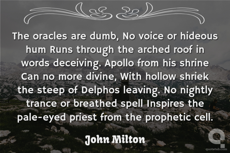 The oracles are dumb, No voice or hideous hum Runs through the arched roof in words deceiving. Apollo from his shrine Can no more divine, With hollow shriek the steep of Delphos leaving. No nightly trance or breathed spell Inspires the pale-eyed priest from the prophetic cell.