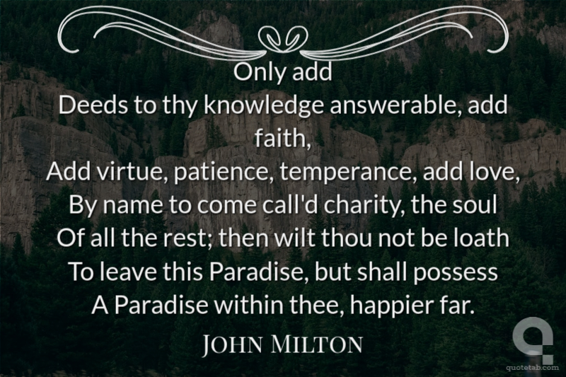 Only add Deeds to thy knowledge answerable, add faith, Add virtue, patience, temperance, add love, By name to come call'd charity, the soul Of all the rest; then wilt thou not be loath To leave this Paradise, but shall possess A Paradise within thee, happier far.