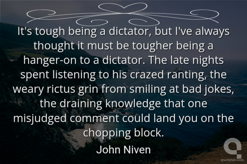 It's tough being a dictator, but I've always thought it must be tougher being a hanger-on to a dictator. The late nights spent listening to his crazed ranting, the weary rictus grin from smiling at bad jokes, the draining knowledge that one misjudged comment could land you on the chopping block.