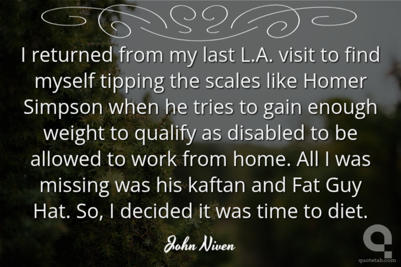 I returned from my last L.A. visit to find myself tipping the scales like Homer Simpson when he tries to gain enough weight to qualify as disabled to be allowed to work from home. All I was missing was his kaftan and Fat Guy Hat. So, I decided it was time to diet.