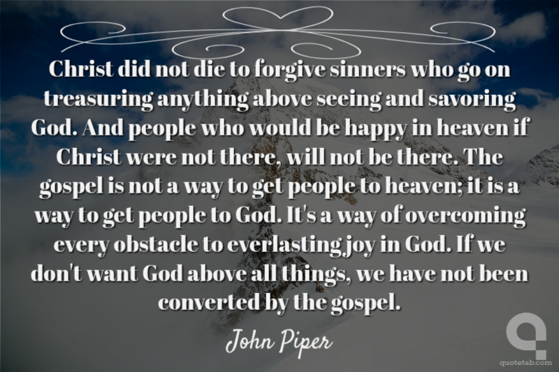 Christ did not die to forgive sinners who go on treasuring anything above seeing and savoring God. And people who would be happy in heaven if Christ were not there, will not be there. The gospel is not a way to get people to heaven; it is a way to get people to God. It's a way of overcoming every obstacle to everlasting joy in God. If we don't want God above all things, we have not been converted by the gospel.