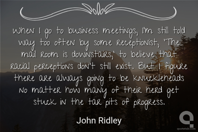 When I go to business meetings, I'm still told way too often by some receptionist, 'The mail room is downstairs,' to believe that racial perceptions don't still exist. But I figure there are always going to be knuckleheads no matter how many of their herd get stuck in the tar pits of progress.