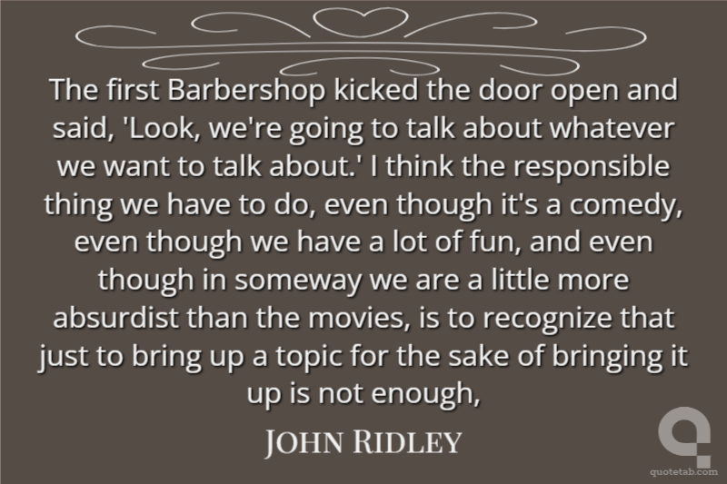 The first Barbershop kicked the door open and said, 'Look, we're going to talk about whatever we want to talk about.' I think the responsible thing we have to do, even though it's a comedy, even though we have a lot of fun, and even though in someway we are a little more absurdist than the movies, is to recognize that just to bring up a topic for the sake of bringing it up is not enough,