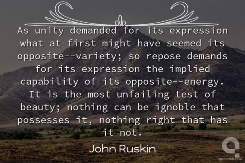As unity demanded for its expression what at first might have seemed its opposite--variety; so repose demands for its expression the implied capability of its opposite--energy. It is the most unfailing test of beauty; nothing can be ignoble that possesses it, nothing right that has it not.