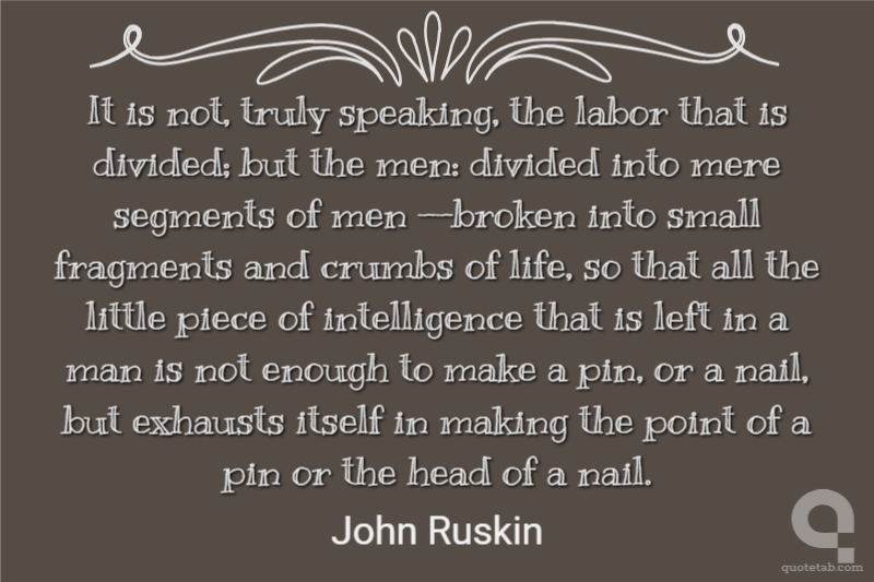 It is not, truly speaking, the labor that is divided; but the men: divided into mere segments of men --broken into small fragments and crumbs of life, so that all the little piece of intelligence that is left in a man is not enough to make a pin, or a nail, but exhausts itself in making the point of a pin or the head of a nail.