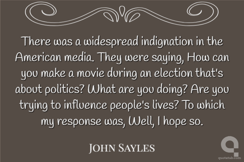 There was a widespread indignation in the American media. They were saying, How can you make a movie during an election that's about politics? What are you doing? Are you trying to influence people's lives? To which my response was, Well, I hope so.