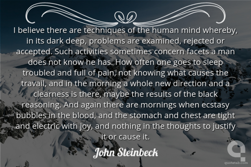I believe there are techniques of the human mind whereby, in its dark deep, problems are examined, rejected or accepted. Such activities sometimes concern facets a man does not know he has. How often one goes to sleep troubled and full of pain, not knowing what causes the travail, and in the morning a whole new direction and a clearness is there, maybe the results of the black reasoning. And again there are mornings when ecstasy bubbles in the blood, and the stomach and chest are tight and electric with joy, and nothing in the thoughts to justify it or cause it.