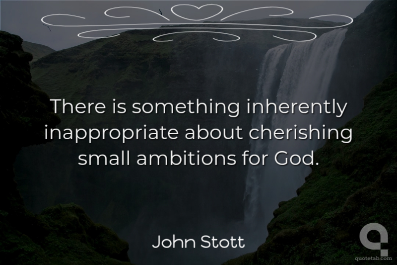 Ambitions for self may be quite modest. . . . Ambitions for God, however, if they are to be worthy, can never be modest. There is something inherently inappropriate about cherishing small ambitions for God. How can we ever be content that he should acquire just a little more honour in the world? No. Once we are clear that God is King, then we long to see him crowned with glory and honour, and accorded his true place, which is the supreme place. We become ambitious for the spread of his kingdom and righteousness everywhere.