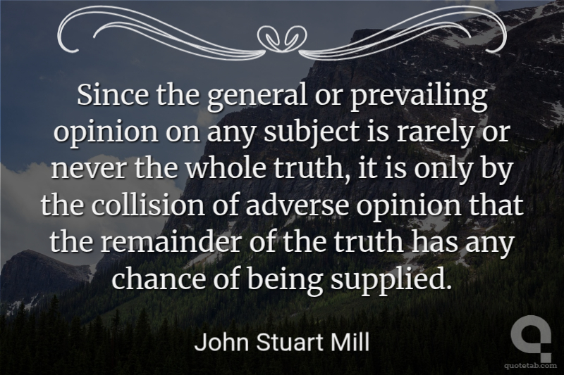 Since the general or prevailing opinion on any subject is rarely or never the whole truth, it is only by the collision of adverse opinion that the remainder of the truth has any chance of being supplied.