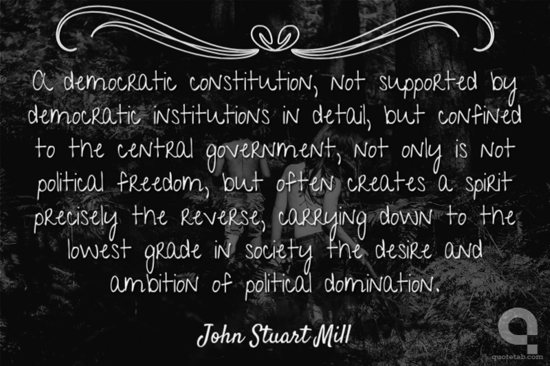 A democratic constitution, not supported by democratic institutions in detail, but confined to the central government, not only is not political freedom, but often creates a spirit precisely the reverse, carrying down to the lowest grade in society the desire and ambition of political domination.