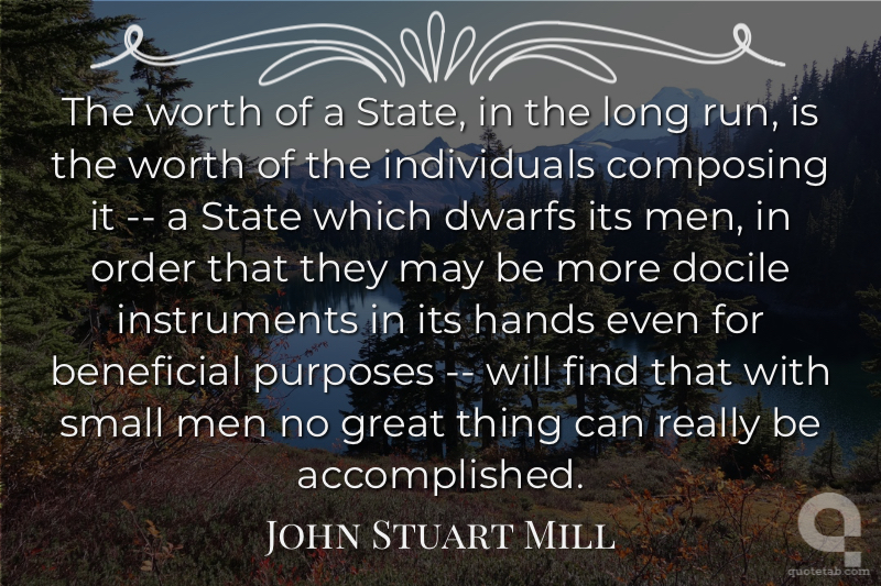 The worth of a State, in the long run, is the worth of the individuals composing it -- a State which dwarfs its men, in order that they may be more docile instruments in its hands even for beneficial purposes -- will find that with small men no great thing can really be accomplished.