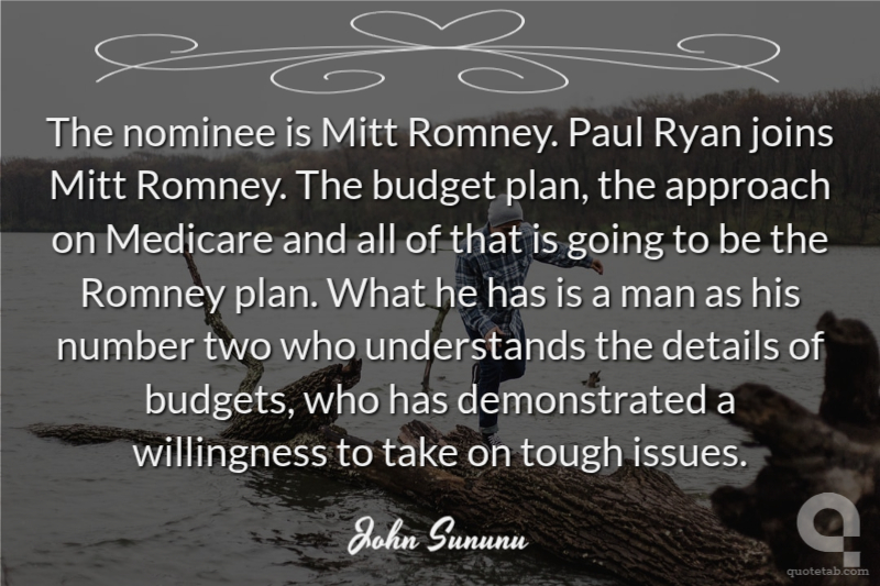 The nominee is Mitt Romney. Paul Ryan joins Mitt Romney. The budget plan, the approach on Medicare and all of that is going to be the Romney plan. What he has is a man as his number two who understands the details of budgets, who has demonstrated a willingness to take on tough issues.