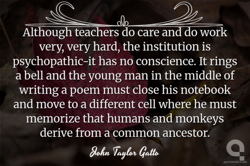 Although teachers do care and do work very, very hard, the institution is psychopathic-it has no conscience. It rings a bell and the young man in the middle of writing a poem must close his notebook and move to a different cell where he must memorize that humans and monkeys derive from a common ancestor.