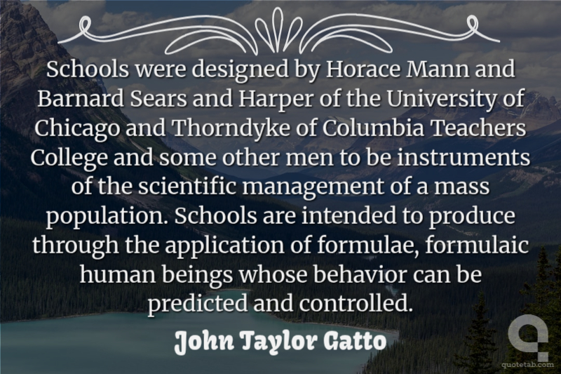 Schools were designed by Horace Mann and Barnard Sears and Harper of the University of Chicago and Thorndyke of Columbia Teachers College and some other men to be instruments of the scientific management of a mass population. Schools are intended to produce through the application of formulae, formulaic human beings whose behavior can be predicted and controlled.