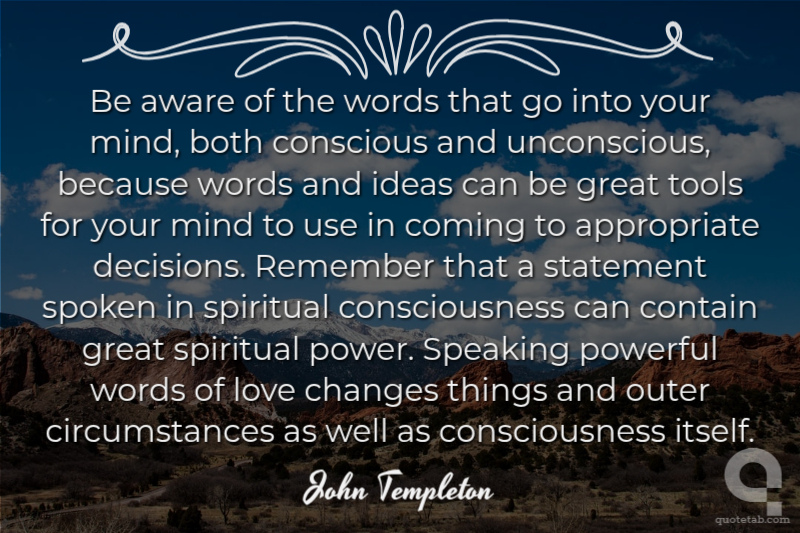 Be aware of the words that go into your mind, both conscious and unconscious, because words and ideas can be great tools for your mind to use in coming to appropriate decisions. Remember that a statement spoken in spiritual consciousness can contain great spiritual power. Speaking powerful words of love changes things and outer circumstances as well as consciousness itself.