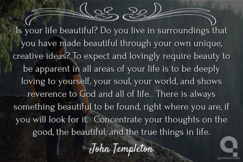 Is your life beautiful? Do you live in surroundings that you have made beautiful through your own unique, creative ideas? To expect and lovingly require beauty to be apparent in all areas of your life is to be deeply loving to yourself, your soul, your world, and shows reverence to God and all of life. There is always something beautiful to be found, right where you are, if you will look for it. Concentrate your thoughts on the good, the beautiful, and the true things in life.