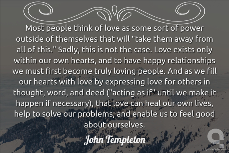 Most people think of love as some sort of power outside of themselves that will "take them away from all of this." Sadly, this is not the case. Love exists only within our own hearts, and to have happy relationships we must first become truly loving people. And as we fill our hearts with love by expressing love for others in thought, word, and deed ("acting as if" until we make it happen if necessary), that love can heal our own lives, help to solve our problems, and enable us to feel good about ourselves.