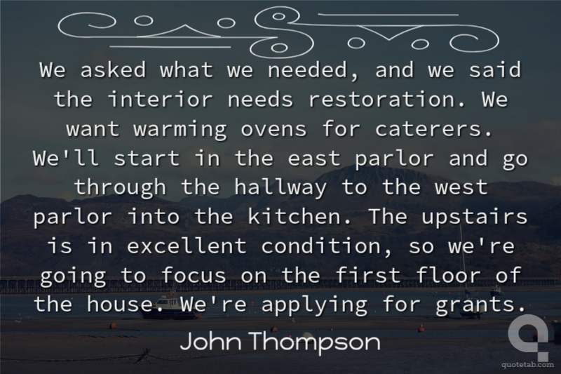 We asked what we needed, and we said the interior needs restoration. We want warming ovens for caterers. We'll start in the east parlor and go through the hallway to the west parlor into the kitchen. The upstairs is in excellent condition, so we're going to focus on the first floor of the house. We're applying for grants.