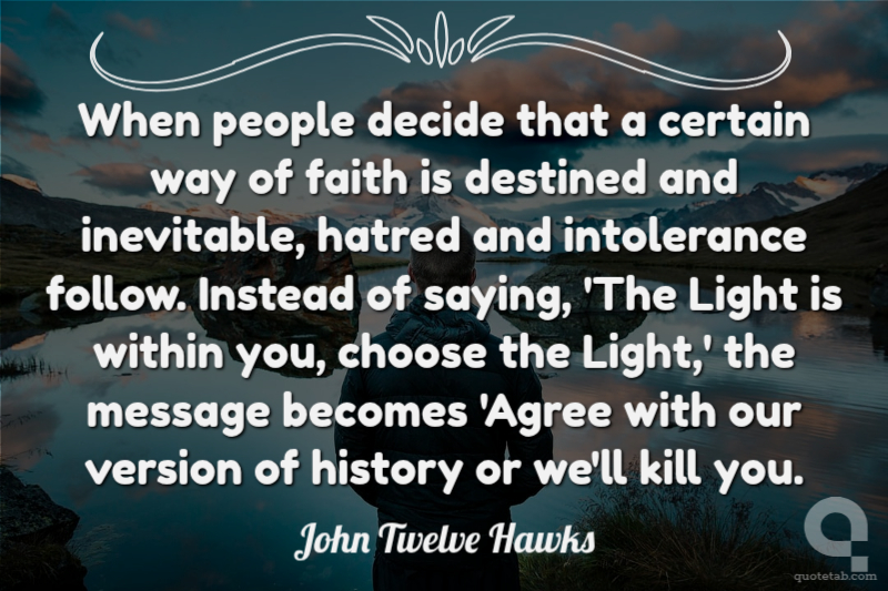 When people decide that a certain way of faith is destined and inevitable, hatred and intolerance follow. Instead of saying, 'The Light is within you, choose the Light,' the message becomes 'Agree with our version of history or we'll kill you.