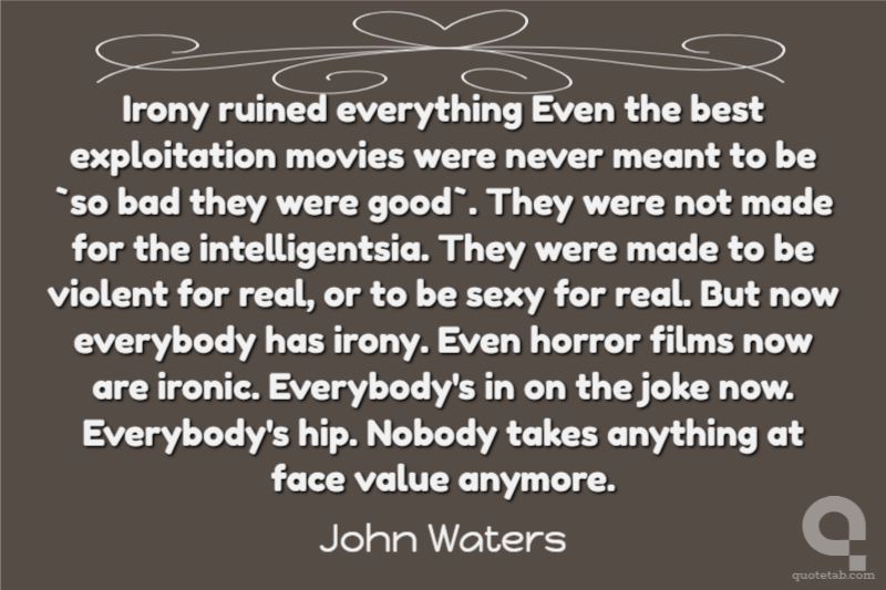 Irony ruined everything Even the best exploitation movies were never meant to be `so bad they were good`. They were not made for the intelligentsia. They were made to be violent for real, or to be sexy for real. But now everybody has irony. Even horror films now are ironic. Everybody's in on the joke now. Everybody's hip. Nobody takes anything at face value anymore.