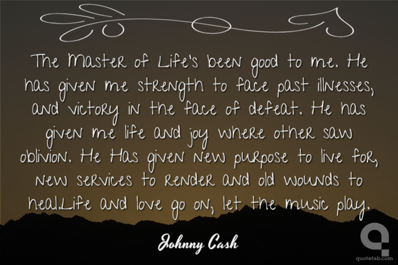 The Master of Life's been good to me. He has given me strength to face past illnesses, and victory in the face of defeat. He has given me life and joy where other saw oblivion. He Has given new purpose to live for, new services to render and old wounds to heal.Life and love go on, let the music play.