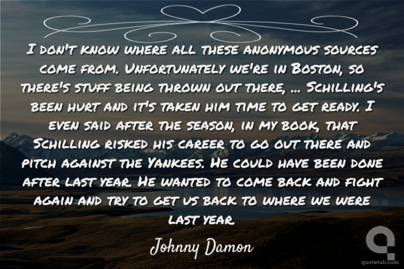 I don't know where all these anonymous sources come from. Unfortunately we're in Boston, so there's stuff being thrown out there, ... Schilling's been hurt and it's taken him time to get ready. I even said after the season, in my book, that Schilling risked his career to go out there and pitch against the Yankees. He could have been done after last year. He wanted to come back and fight again and try to get us back to where we were last year.