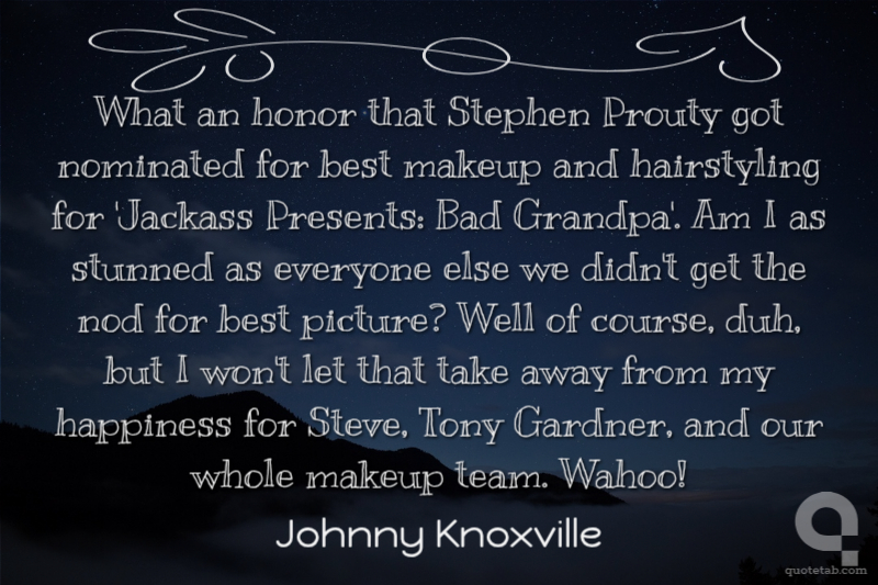 What an honor that Stephen Prouty got nominated for best makeup and hairstyling for 'Jackass Presents: Bad Grandpa'. Am I as stunned as everyone else we didn't get the nod for best picture? Well of course, duh, but I won't let that take away from my happiness for Steve, Tony Gardner, and our whole makeup team. Wahoo!