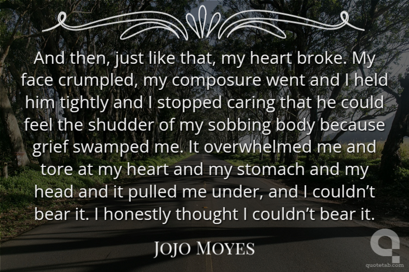 And then, just like that, my heart broke. My face crumpled, my composure went and I held him tightly and I stopped caring that he could feel the shudder of my sobbing body because grief swamped me. It overwhelmed me and tore at my heart and my stomach and my head and it pulled me under, and I couldn’t bear it. I honestly thought I couldn’t bear it.