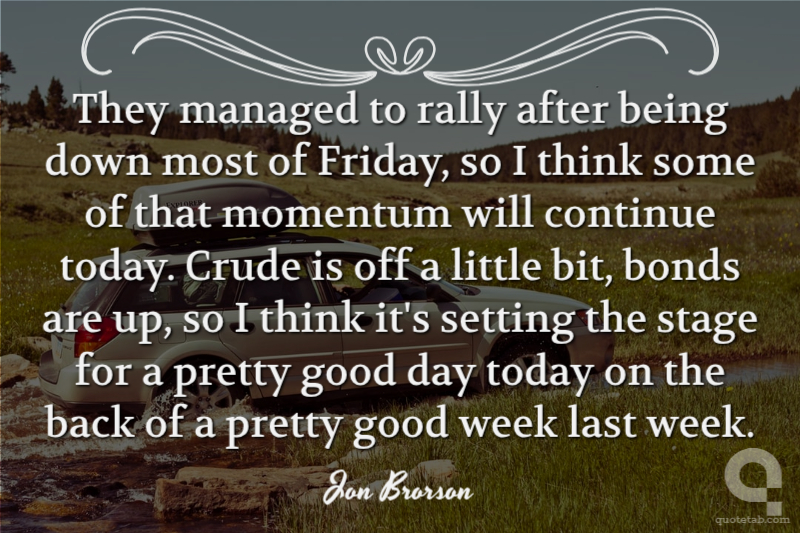 They managed to rally after being down most of Friday, so I think some of that momentum will continue today. Crude is off a little bit, bonds are up, so I think it's setting the stage for a pretty good day today on the back of a pretty good week last week.